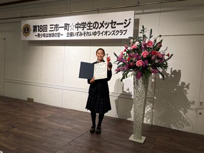いずみそれいゆライオンズクラブ主催の「第18回 三市一町☆中学生のメッセージ~青少年は地球の宝~」が11月8日(土)に関空泉大津ワシントンホテルで開催され、本校から2年1組の東 栄理菜さんが出場しました。